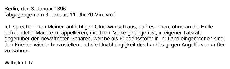 Mit der Krüger-Depesche – ein Telegramm, das Kaiser Wilhelm II. am 3. Januar 1896 an Paul Krüger, den Präsidenten der Südafrikanischen Republik (Transvaal), schickte – gratulierte er Krüger zum Sieg über die britischen Freischärler, die im sogenannten Jameson-Raid versucht hatten, die Unabhängigkeit Transvaals zu untergraben. Das Telegramm enthielt die ausdrückliche Anerkennung der Unabhängigkeit Transvaals und verurteilte die britischen Angreifer als "Friedensstörer". Das traf ja zu. Die britischen Freischärler waren infiltriert worden, um zu gegebener Zeit dem britischen Militär einen Vorwand zum Einmarsch zu liefern, ähnlich wie es die USA bei der "Übernahme" von Texas erfolgreich vorgemacht hatten. In Großbritannien wurde das Telegramm als Beleidigung empfunden und erfolgreich zur Verstärkung antideutscher Ressentiments benutzt. (50) Die Spannungen zwischen dem Deutschen Reich und Großbritannien verschärfte sich erheblich.