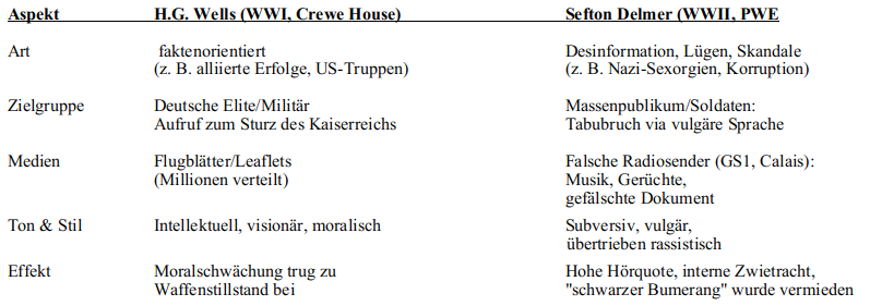 Wells' Propaganda im Ersten Weltkrieg und Delmers Methoden im Zweiten unterschieden sich grundlegend in Stil, Medium und Ethik, wobei beide die deutsche Moral schwächen sollten. (26)