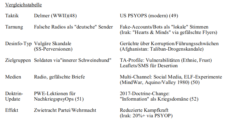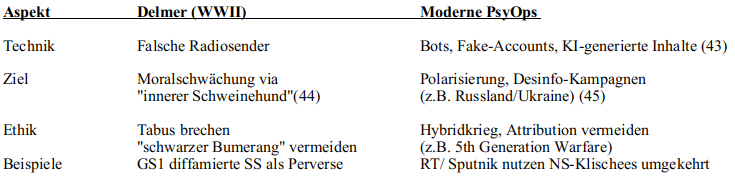 US PSYOPS nutzen Delmer-ähnliche Taktiken vor allem durch Tarnung als interne Quellen, gezielte Desinformation und Ausnutzung psychologischer Schwächen, um die Feindmoral zu untergraben, ohne Zuordnung oder Namensnennung (Attribution) zu riskieren. (46)